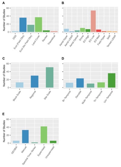 Summary statistics for the 99 publications reviewed showing the type of study (A), type of sensor (B), spatial extent of study (C), temporal scale (D), and classification methods employed (E).