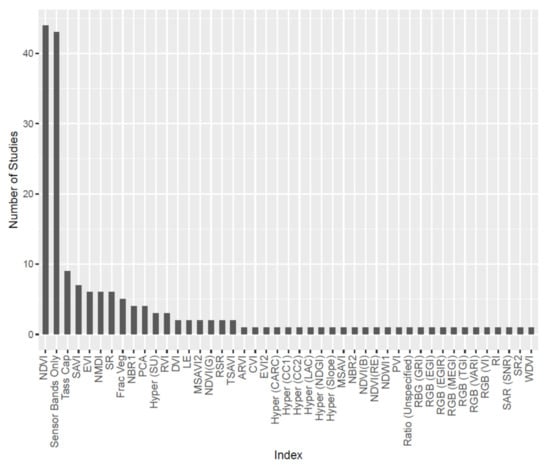 Figure 4 shows the frequency of spectral indices used as a total of the reviewed publications. Normalized Differenced Vegetation Index (NDVI) was the most common index used, with 44 studies (44%) employing the index. A total of 43 studies (43%) did not employ an index and used sensor bands, most commonly within a supervised classification (47%). The orthogonal indices tessellated cap and principal component analysis (PCA) were used in 9 studies (9%) and 4 studies (4%), respectively; while 7 studies (7%) used soil adjusted vegetation index (SAVI). Six (6) studies used enhanced vegetation index (EVI), normalized moisture difference index (NMDI), and simple ratio (SR), while 5 studies used fractional vegetation cover (Frac Veg). A total of 6 narrow band indices were used with hyperspectral imagery, while 7 indices were used with standard color (RGB) imagery from drone studies.