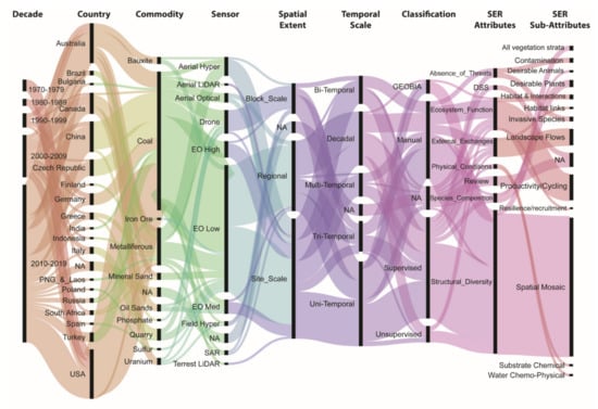 Alluvial chart demonstrating the proportions within variables and the correlations between variables. From Left to Right: Decade of publication, Country of study, Commodity, Sensor used in study, Spatial Extent, Temporal Scale, Classification method, ecological attribute, and ecological sub-attribute. NA = review papers, DSS, and theoretical papers.