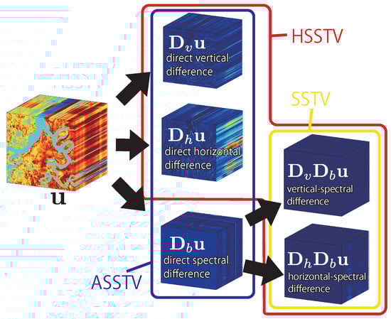 In (8), D D b u and D u correspond to local spatio-spectral and direct local spatial differences, respectively, as shown in Figure 1 (red lines). The weight ω adjusts the relative importance of direct spatial piecewise-smoothness to spatio-spectral piecewise-smoothness. HSSTV evaluates two kinds of smoothness by taking the p norm ( p = 1 or 2) of these differences associated with each pixel and then summing up for all pixels, i.e., calculating the 1 norm. Thus, it can be defined via the mixed 1 , p norm. When we set ω = 0 and p = 1 , HSSTV recovers SSTV as (6), meaning that HSSTV can be seen as a generalization of SSTV.