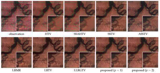 First, we experimented on the Gaussian-sparse mixed noise removal of HS images. The observed HS images included an additive white Gaussian noise n with the standard deviation σ and sparse noise s . In these experiments, we assumed that sparse noise consists of salt-and-pepper noise and vertical and horizontal line noise, with these noise ratio in all pixels being s p , l v , and l h , respectively. We generated noisy HS images by adding two types of mixed noise to groundtruth HS images: (i) ( σ , s p , l v = l h ) = ( 0.05 , 0.04 , 0.04 ) , (ii) ( 0.1 , 0.05 , 0.05 ) . In the denoising case, Φ = I in (9), and the radiuses ε and η in Problem (10) were set to 0.83 N B ( 1 ( s p ( 1 l v l h ) + l v + l h l v l h ) ) σ 2 and N B ( 0.45 s p + ( l v + l h ) v a v e l v l h v a v e ) , respectively, where v a v e is the average of the observed image. Table 2 shows the parameters settings for ASSTV, LRMR, LRTV, LLRGTV, and the proposed method. We set these parameters to achieve the best performance for each method.