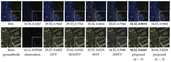 Figure 6 is the reconstructed results on KSC and Reno with the random sampling ratio m = 0.4 and 0.2 , respectively. Here, the HS images are depicted as RGB images (R = 8th, G = 16th, and B = 32nd bands). One can see that (i) HTV and SSAHTV cause spatial oversmoothing, (ii) SSTV produces artifacts and spectral distortion, appearing different from the color of the groundtruth HS images, and (iii) the results by ASSTV have spatial oversmoothing and spectral distortion. On the other hand, the proposed method reconstructs meaningful details without both artifacts and spectral distortion.