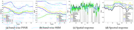 Figure 7 plots band-wise PSNR or SSIM (left) and spatial and spectral responses (right) (Suwannee, m = 0.2 ). According to band-wise PSNR and SSIM, one can see that the proposed method achieves higher-quality reconstruction for all bands than HTV, SSAHTV, SSTV, and ASSTV. Graphs (c) and (d) plot the spatial and spectral responses of the same position in Section 5.1. Graph (c) shows that (i) the spatial response of the results by HTV, SSAHTV, and ASSTV are oversmoothing, (ii) SSTV produces undesirable variation, and (iii) the spatial response reconstructed by the proposed method is similar to the groundtruth one. In graph (d), HTV and SSAHTV generate undesirable variation, and ASSTV causes oversmoothing. Thanks to the evaluation of spatio-spectral piecewise-smoothness, SSTV reconstructs a similar spectral response to the groundtruth one. However, the mean value is larger than the groundtruth value. The proposed method achieves the most similar reconstruction of spectral response among all the TVs.
