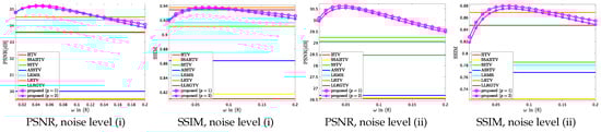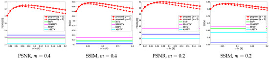 Figure 8 and Figure 9 plot PSNR or SSIM of the results by the proposed method versus various ω on the mixed noise removal and CS reconstruction experiments, respectively, where the values of PSNR and SSIM are averaged over the 13 HS images. One can see that ω [ 0.03 , 0.07 ] is a good choice in the mixed noise removal case, and ω [ 0.05 , 0.1 ] is a good choice in most cases in the CS case. The results show that the suitable range of ω in CS reconstruction is almost the same as mixed noise removal. ASSTV and LRTV require adjusting the weight τ b and the hyperparameter τ newly for difference noise intensity, respectively, but the suitable parameter ω in HSSTV is noise-robust.