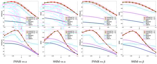 Figure 10. PSNR or SSIM versus α or β on the mixed noise removal experiment (the noise level (ii), top: DC, bottom: KSC).