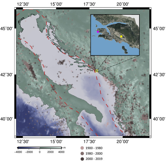 The study area shown in a topographic map (ETOPO1 topography/bathymetry model [36]) related to a broader geographical area showing seismic activities (epicenters of all registered earthquakes of magnitude >4.0 from 1990, shown by ‘+’; data downloaded from [25]) and known plate tectonics (border of the Adriatic tectonic plate shown in red; according to [37]); pink circle represents the tide gauge station whereas yellow square shows collocated GNSS station.