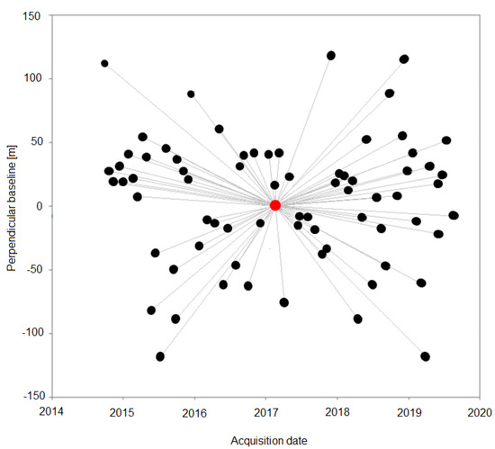 Spatio-temporal relation-baseline plot; master image (red dot) and slave images (black dots).