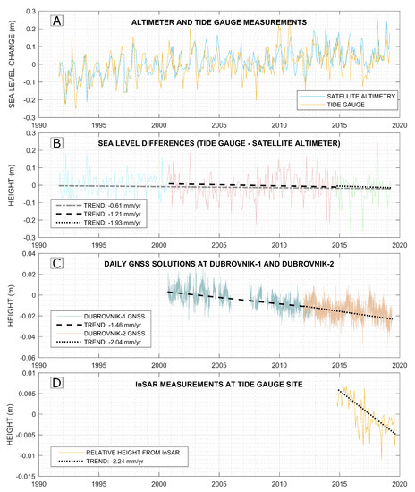 Processed observations and computed VLM trends; subplot A presents original filtered and processed altimeter and tide gauge data; subplot B shows the differences between the sea-level data presented in subplot A and the trends for three defined periods-from 1992 (altimeter era), from 2000 (Global Navigation Satellite System (GNSS) observation period in the study area), and from 2014 (Interferometric Synthetic Aperture Radar (InSAR) observation period); subplot C presents GNSS data obtained in Dubrovnik at two GNSS stations for the periods 2000–2012 and 2011–2020 along with the computed VLM trends for two observation periods (the same trend is computed for InSAR period, from 2014); subplot D presents an averaged Sentinel-1 InSAR measurements over the period 2014–2020 at tide gauge location with the VLM trend line.