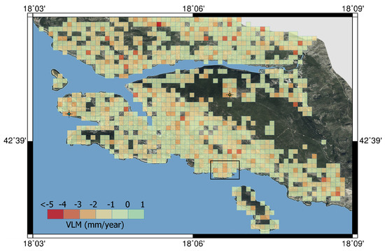 VLM trends computed from Sentinel-1 InSAR data for the period 2014–2020; each cell of approximately 100 × 100 m is represented by the weighted average of the VLM within the cell (3–15 estimates); the positions of the GNSS and tide gauge station are shown by the cross with yellow and cyan circle, respectively; the black box marks the old town of Dubrovnik; the orthophoto background map was downloaded from [60].