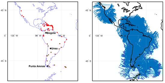 An overview of the GNSS network and observations used in this study, where the left plot indicates the distribution of 62 GNSS reference stations, and the right plot shows the distribution of ionospheric observations (blue dots). Three stations are shown by black dots on the left plot, which correspond to Bogota (lat = 4.64007 and lon = 285.91906 in Columbia), Unsa (lat = −24.72746 and lon = 294.59236 in Argentina), and Punta Arenas (lat = −53.13695 and lon = 289.12011 in Chile).