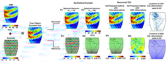 In order to validate our modelling approach, a synthetic example is designed to assess the ability of the Bayesian approach in recovering the regional signals. To introduce the ‘true’ VTEC patterns, the spherical harmonic coefficients of the GIM/CODE is used to produce a smooth grid with 0.5 degree resolution that covers South America. Then, we added periodic oscillations with the magnitude of 10 TECU on the top of GIM (see Figure 3, plot on the left). For comparison, we show a simple synthesizing of the true signal using the spherical harmonics expansions of degree and order 15 and 90 in Figure 3A1,A2, respectively. Their differences with the true pattern are shown in B1 and B2, respectively. The regionalize VTEC estimation method is implemented by considering the low-degree VTEC estimates of Figure 3A1 as a priori information.