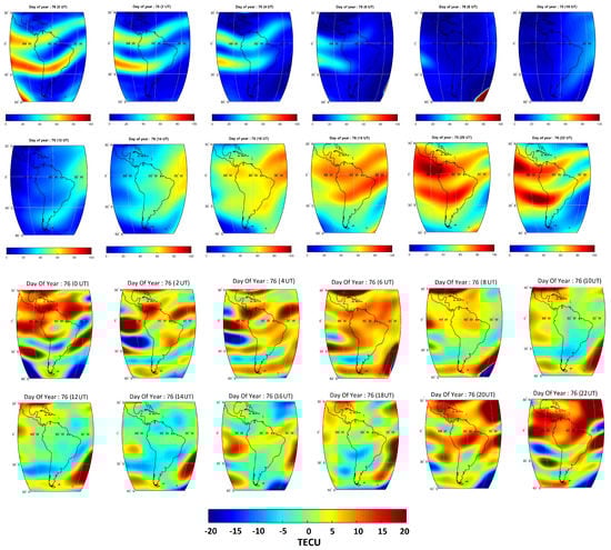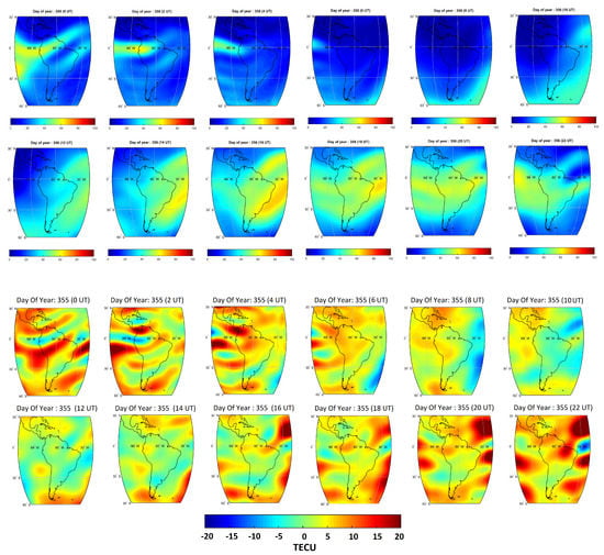 Two-hourly snapshots of the regionalized VTEC maps for 17 March (DOY 76) and 21 December 2013 (DOY 355) are presented in 12 maps presented on the top panel of Figure 4 and Figure 5, respectively. These values are presented as TEC Unite (TECU). Considering these maps, the ionosphere maximum appears around the local noon as travelling along with the Sun. Relatively bigger values estimated in DOY 76 (compared to DOY 355) are related to the higher magnetic activity during this day (i.e., the values of these days were and , respectively). Equatorial TEC anomalies can be detected in both days, where a sunrise enhancement is seen in VTEC estimates at 12:00 UT during both days. The high values of TEC at 19:00 and 23:00 UT are related to the physical structures of the diurnal equatorial ionization anomaly and its resurgence after sunset, respectively [,,].