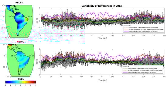 The ICA results (first two independent modes) of VTEC differences (GIM/CODE—regionalized estimate) for the entire 2013. The left plots are anomaly maps in terms of TECU, which can be multiplied by the unit-less time series (ICs) and provide statistically independent modes of VTEC differences.