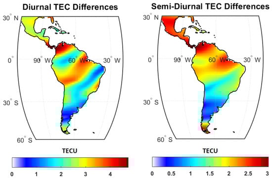 The amplitudes of diurnal (left) and semi-diurnal (right) VTEC differences (regionalized estimates—GIM/CODE) during 2013.