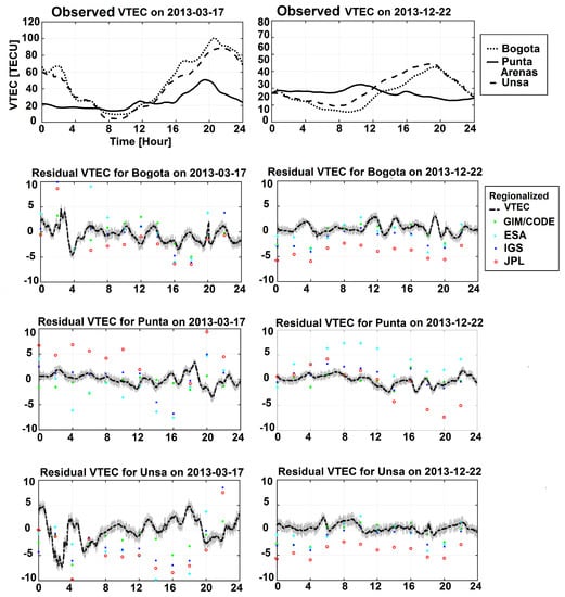 In this section, we evaluate the regionalized VTEC estimates by comparing them with those derived from other groups. For this, TEC values along the line of sights between GNSS stations and satellites are computed (Equation (1)). These values are then converted to VTEC by implementing the single layer mapping function (Equation (3)) [], and the results are compared with other models. As reference stations, we used the dual frequency GPS observations of Bogota (lat = 4.64007 and lon = 285.91906), Unsa (lat = −24.72746 and lon = 294.59236) and Punta Arenas (lat = −53.13695 and lon = 289.12011). These observations were not used in the regionalized VTEC estimates of this study, but they are used for validations (locations of the stations are shown by three black dots in Figure 1).