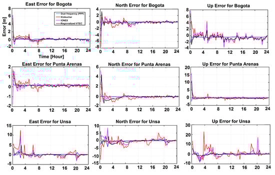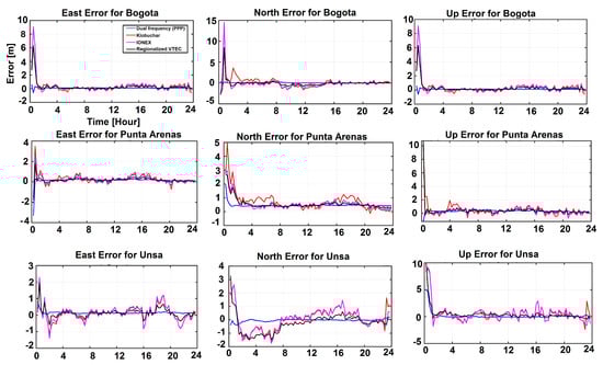 Three GNSS stations (i.e., Bogota, Unsa and Punta Arenas) of Section 4.3 are chosen to assess the impact of VTEC estimates on the positioning accuracy. The dates of assessments are also chosen to be the same as previous section to make the interpretation easier. As a measure of accuracy, the Root Mean Squares Error (RMSE) of the positioning residuals is calculated. To compute an accurate position (to be used as reference for estimating the position accuracy), the Precise Point Positioning (PPP) solution as in [] is chosen as our computation technique. Ionospheric-free combination is created using GPS observations including both L1 and L2 signals. Based on this, station coordinates, receiver clock error, systems time difference parameters with the GPS system, troposphere parameter and phase ambiguity are estimated during 24 h of 17 March 2013 (DOY 76 with ) and 21 December 2013 (DOY 355 with ). Table 2 presents the processing strategy and the error modelling for the performed PPP experiment. It is worth mentioning that the convergence period of the PPP experiments was not considered in the computation of the quality measures.