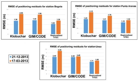 Figure 11 summarizes the RMSE of the positioning residuals for each station compared with errors from the dual frequency PPP estimates. In comparison with GIM/CODE and Klobuchar models, the use of regionalized VTEC estimates improves the positioning accuracy by 30% and 33% for Bogota, 25% and 38% for Punta Arenas, as well as 24% and 42% for Unsa during 17 March 2013. These values are found to be 27% and 24% for Bogota, 15% and for Punta Arenas, as well as 28% and 29% for Unsa during 21 December 2013, respectively. The differences in the magnitude of improvements are related to the differences in geomagnetic activity of these two days.
