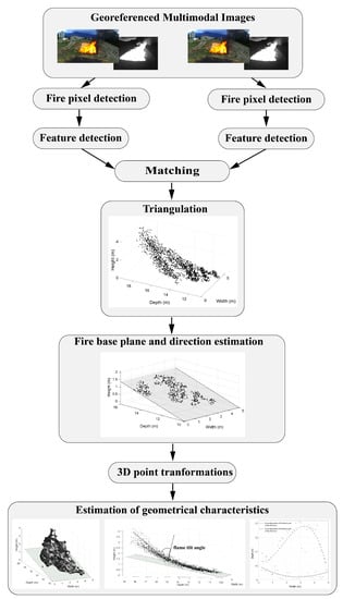 - Rossi, L.; Akhloufi, M.; Tison, Y. On the use of stereovision to develop a novel instrumentation system to extract geometric fire fronts characteristics. Fire Saf. J. 2011, 46, 9–20. [Google Scholar] [CrossRef]