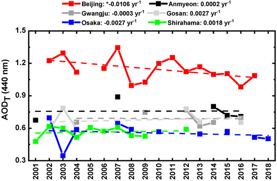 Variations of annual mean AODT at 440 nm from 2001 to 2018 at six sites. * (units AODT yr−1).