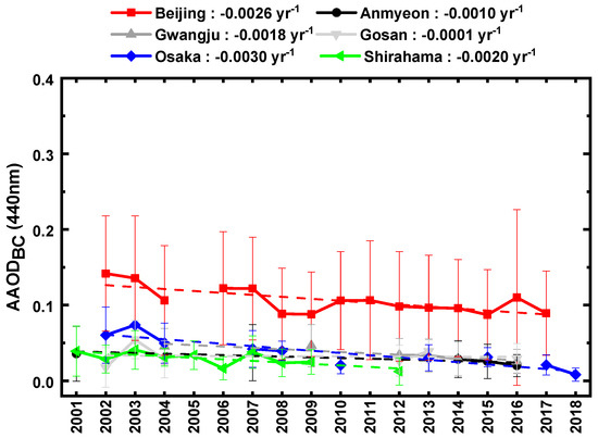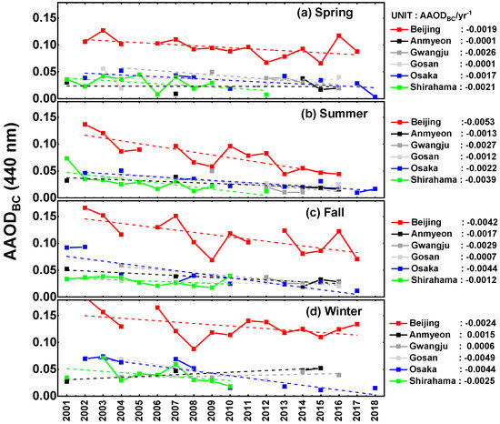 According to Figure 4, there is a distinct seasonal trend for AAODBC, with higher values in winter and lower values in summer. The BC emissions from residential heating accounted for the generally higher winter values of AAODBC. The highest mean AAODBC (approximately 0.17) was observed at Beijing in winter 2002; this value had dropped to 0.05 by summer 2016. The mean values in Korea and Japan were consistently lower (less than 0.10) than those observed in China over all seasons. Several studies have reported similar seasonal trends of BC concentrations (lowest in summer, highest in winter) at Chinese sites [68,69]. Zhuang et al. [70] found considerable seasonal variations in BC emissions over East Asia, predominantly driven by changing domestic and residential emissions. Kang et al. [71] attributed increased AAOD over the North China Plain and the Korean Peninsula during winter to seasonal increases of BC and organic carbon (OC) emissions. Incomplete combustion of fossil fuel for domestic heating is a significant source of BC and OC [72], and the strong light-absorbing properties of BC partly explain the increased AAODBC during winter.