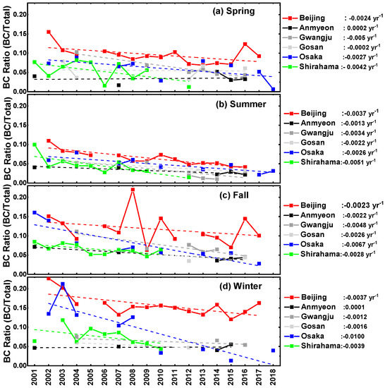 Figure 7b presents the monthly variation of BC ratio from 2001 to 2018. The highest values were in Beijing, peaking in November, December, and January; the lower values were in August. The next-highest values were at the Japanese sites (Osaka and Shirahama), while the Korean sites showed the lowest BC ratios.
