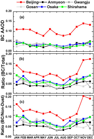 Figure 7c shows that the monthly mean variations of the ratio of AAODBC to AODnd increased sharply from October to February, and was lowest in late summer (August) for Beijing. This suggests a higher contribution of BC to AAOD during the colder months (November to January) than at other times of the year. The average ratio of AAODBC to AODnd at 440 nm during 2001–2018 varied between 0.10 and 0.02 at the Korean and Japanese sites, with the Japanese sites showing higher values than those in Korea. Values were highest in December and January, and lowest in July and August. The residential sector was likely the main reason the ratio of AAODBC to AODnd increased during the colder months over these regions.