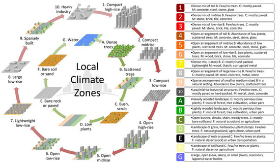 - Stewart, I.D.; Oke, T.R. Local climate zones for urban temperature studies. Bull. Am. Meteorol. Soc. 2012, 93, 1879–1900. [Google Scholar] [CrossRef]