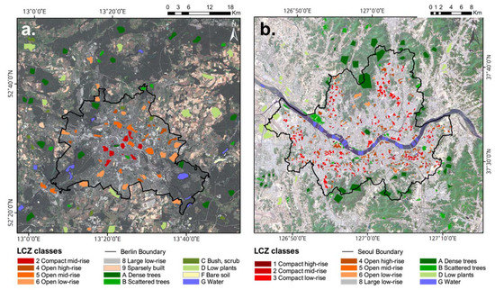 - Verdonck, M.-L.; Okujeni, A.; van der Linden, S.; Demuzere, M.; De Wulf, R.; Van Coillie, F. Influence of neighbourhood information on ‘Local Climate Zone’mapping in heterogeneous cities. Int. J. Appl. Earth Obs. Geoinf. 2017, 62, 102–113. [Google Scholar] [CrossRef]