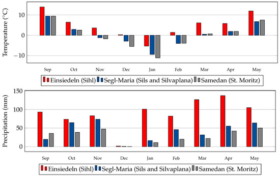 Bar graphs of mean monthly air temperature 2m above ground (top) and total monthly precipitation (bottom) in winter 2016–2017, recorded at the meteorological stations closest to the respective lakes. Data courtesy of MeteoSwiss.
