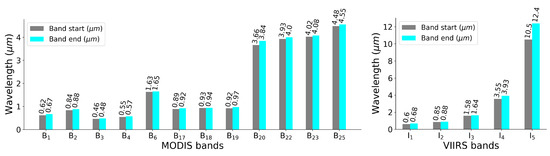 Spectral range of MODIS (left) and VIIRS (right) bands used in our analysis. The start and end wavelengths are shown for each band.
