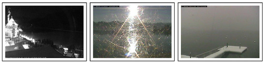 Example images that were discarded from the dataset due to bad illumination (left), sun over-exposure (middle), and thick fog (right).