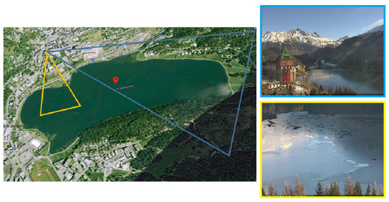 44]). Regions around the four target lakes (shown as blue and yellow rectangles on the map) are zoomed in and shown on the right side of the map (lake Sihl on the left, region around lakes Sils, Silvaplana, St. Moritz on the right). On the second row, the image footprints of two webcams monitoring lake St. Moritz are displayed (Camera 0 and 1 images were captured on 14 December 2016 and 13 December 2016 respectively when the lake was partially frozen). Best if viewed on screen.