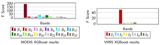 right) showing the significance of each of the selected bands (12 for MODIS, 5 for VIIRS) for frozen vs. non-frozen pixel separation using the