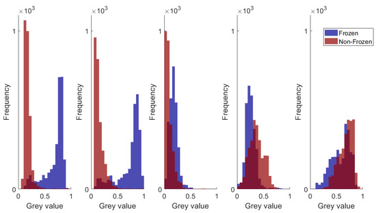 VIIRS grey-value histograms for sanity check (Bands , , , , are respectively shown from left to right).