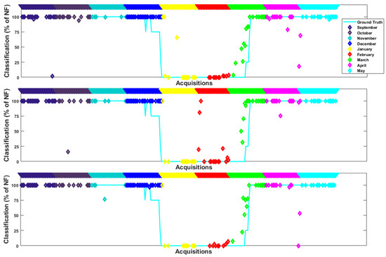 MODIS (top) and VIIRS (middle) timeline results of lake Sihl for full winter 16–17 using linear kernel. A timeline of the MODIS snow and ice product (bottom) is also plotted for comparison with our results and the webcam-based ground truth. In all timelines, the x-axis shows all dates that are at least 30% cloud-free in chronological order and the respective results [% of Non-Frozen (NF) pixels] are plotted on the y-axis.