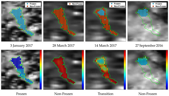 MODIS qualitative results using the linear kernel. Top and bottom rows show classification results and corresponding confidence respectively. Results of cloudy pixels are not displayed. First, second, and third columns show success cases while the fourth column displays a failure case. In the second row, more red means more non-frozen and more blue means more frozen. The dates and ground truth labels are shown below each sub-figure in the first and second rows respectively.