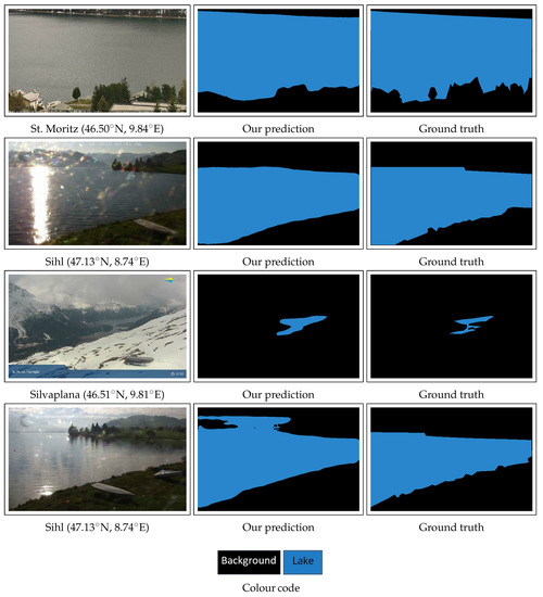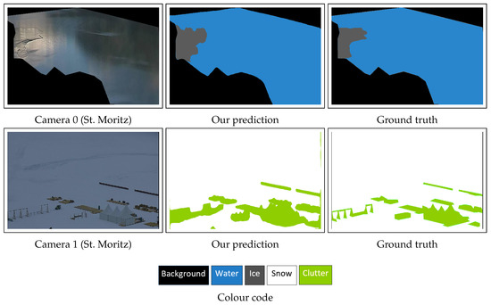Qualitative lake ice segmentation results on webcam images. The colour code is also shown.