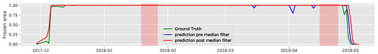 Cross-camera time series results (winter 17–18) of lake St. Moritz using Deep-U-Lab. Results for camera 1 (when trained on camera 0 data) is displayed. All dates are shown in chronological order on the x-axis and the respective results (percentage of frozen pixels) are plotted on the y-axis. Data lost due to technical failures are shown as red bars.