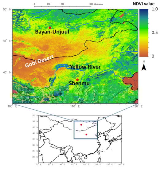 Locations of Shenmu, China, and Bayan-Unjuul, Mongolia, with the distribution of the NDVI in August 2019.