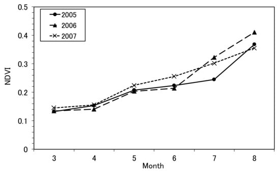 In Bayan-Unjuul, the seasonal NDVI was steady from March to June and then increased rapidly to August (Figure 7). This is a general trend in grass growth in Mongolia, caused by the rainfall concentrated in June and July [19,47]. In Shenmu, however, the NDVI increased slowly from March to August (Figure 3) because of frequent rainfalls. This is a crucial difference in grass growth between the sites. The severe drought in 2017 [44] explains the lower NDVI in July and August 2017 when compared to 2018 and 2019.