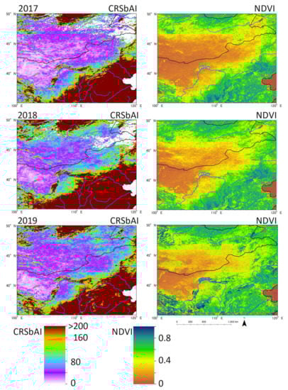 Here, we will discuss the applicability evaluation of the CRSbAI over north-east Asia from 2017 to 2019, the three most recent years; that is, the spatial distribution of the CRSbAI and CdSWC will be examined using the calculation method obtained in Shenmu and Bayan-Unjuul, and validated using past published data.