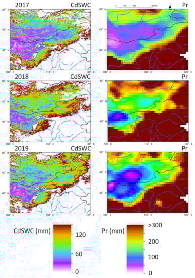 Figure 10 shows the distribution of CdSWC calculated with Equation (7) and the total precipitation (Pr) from April to August 2017 to 2019, using the CPC Global Unified Precipitation data. Since the range of CRSbAI (monthly) was approximately 0 to 150 mm (Figure 6), areas where the CRSbAI were >150 mm were not available. However, areas where the CRSbAI were <150 mm corresponded closely to the Pr distribution: