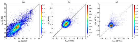 Frequency distributions of (a) ZH, (b) ZDR, and (c) KDP from 2 km CAPPI. The horizontal axis indicates Guangzhou radar data and the vertical axis indicates Yangjiang radar data.