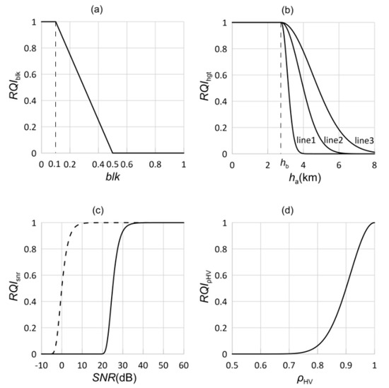 where blk indicates the beam blockages. The influence of partial beam blockages upon radar data quality can be represented by blk. RQIblk is the index affected by partial beam blockages and is calculated based on blk. At any given time, the quality of radar data is generally worse in complex terrains (large blockages) than in flatlands (no blockages). Therefore, when blk is large, the RQIblk is set to small, and vice versa. The model of RQIblk is shown in Figure 6a.