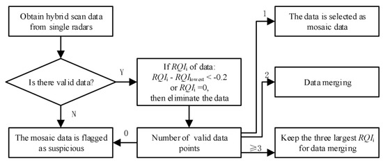 Thus, RQI can represent the quality of radar data under the influence of partial beam blockages, BB, and BB performance, SNR, and non-precipitation echoes; thus, it can be used for data quality comparison. Based on this comparison, low quality data can be identified and eliminated. The polarimetric radar data mosaic algorithm flowchart is shown in Figure 7.