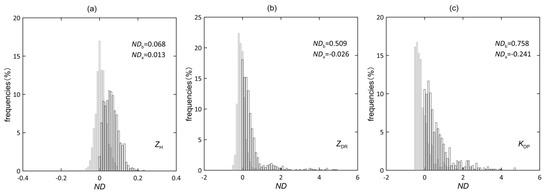 ND frequencies of (a) ZH, (b) ZDR, and (c) KDP are shown with histograms. The gray ones are derived from corrected data, and those with black lines outside are derived from raw data in the BB.