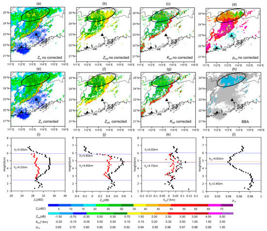 The original mosaics for (a) ZH, (b) ZDR, (c) KDP, and (d) ρHV at 20:54 UTC on 15 June, 2016. The corrected mosaics for (e) ZH, (f) ZDR, and (g) KDP are also shown, respectively. The mosaic data are from the lowest hybrid scans in original polar coordinates. The colors in (h) represent BBA (blue) and non-BBA (gray). The triangles indicate radars. The black circles in (a–h) indicate the main areas that are affected by BB. The AVPDs of (i) ZH, (j) ZDR, (k) KDP, and (l) ρHV, as derived from Guangzhou radar, are also shown. Black dots indicate the original observations, and red dots indicate the corrected values. The corresponding feature heights are marked in the figures.