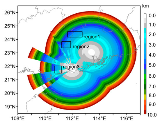 On the hypothesis that echoes produced by precipitation exist in each altitude layer and that there is no noise signal, the ideal mosaic heights of the Guangzhou and Yangjiang radars are shown in Figure 11. Some radial vacancies occur around the radar due to beam blockages for lower tilts at these azimuthal angles. In the hybrid scan strategy, the data from the lower tilt are replaced by those from the upper tilt. Their height differences result in radial vacancies. In the overlap area of the two radars, most mosaic height data are also calculated by the data mosaic formula (13); however, the severe beam blockages of the Yangjiang radar lead to a few irregular heights in this area.