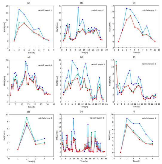 (a–i) Time series of RMSEs derived from the nine rainfall events. QPE is also evaluated in the area less than 180 km from either radar. Green, blue, and red lines represent RMSEs derived from Guangzhou radar QPE, Yangjiang radar QPE, and radar mosaic QPE, respectively.