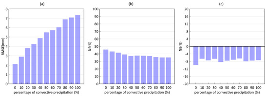 (a) RMSEs, (b) NEs, and (c) NBs changing with the percentage of convective precipitation. The precipitation in these tests is only mixed with convective precipitation and stratiform precipitation. The percentages of stratiform precipitation are from 100% to 0% from left to right.